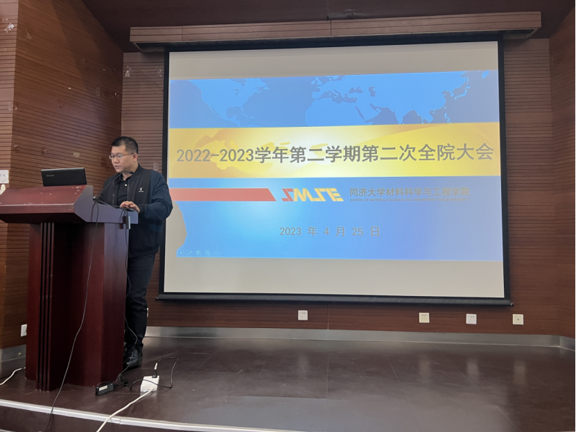 2023年4月25日下午,材料科学与工程学院2022-2023学年第二学期第二次全院大会在德才馆二楼报告厅召开。会议传达学校学习贯彻习近平新时代中国特色社会主义思想主题教育动员大会及实施方案精神、学校2023年度工作要点精神,并就学院相关工作进行布置。会议由许维院长主持。学院党政领导班子和全院教职员工140余人参加会议。