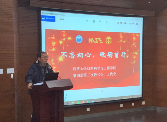 2019年1月23日,材料科学与工程学院以“不忘初心,砥砺前行”为主题在同济大学嘉定校区德才楼二楼报告厅召开了第四届教代会暨工代会第三次全体会议。材料学院学科主任黄云辉、党委书记王中平、党委副书记袁华、王凌凌,,学院教代会代表及列席代表共33人出席了会议。姚武、邱军副院长列席了会议.