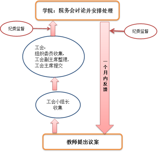 7.院工会在平时收集学院教师提案并提交有关部分处理回复,遇重大问题,在院教职工代表大会进行讨论决议。提案提交程序如下图。提案模板见附录1。