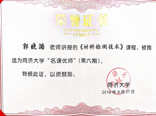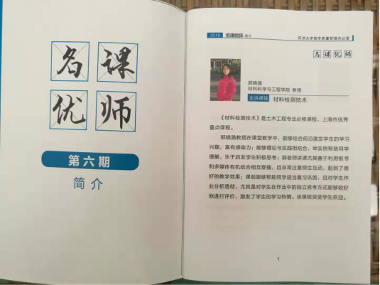 主讲人编撰的课程教材《建筑物无损检测技术》获评同济大学优秀本科生教材二等奖;依托该课程获全国卓越联盟高校青年教师创新大赛三等奖,全国无机非金属材料教学大赛二等奖和三等奖;同济大学名课优师、教学成果三等奖、育才奖、耀华教学奖、坤瑞泰隆新墙材教育奖、英才优青计划、英才骨干计划、三八红旗手、五四奖章提名奖等。