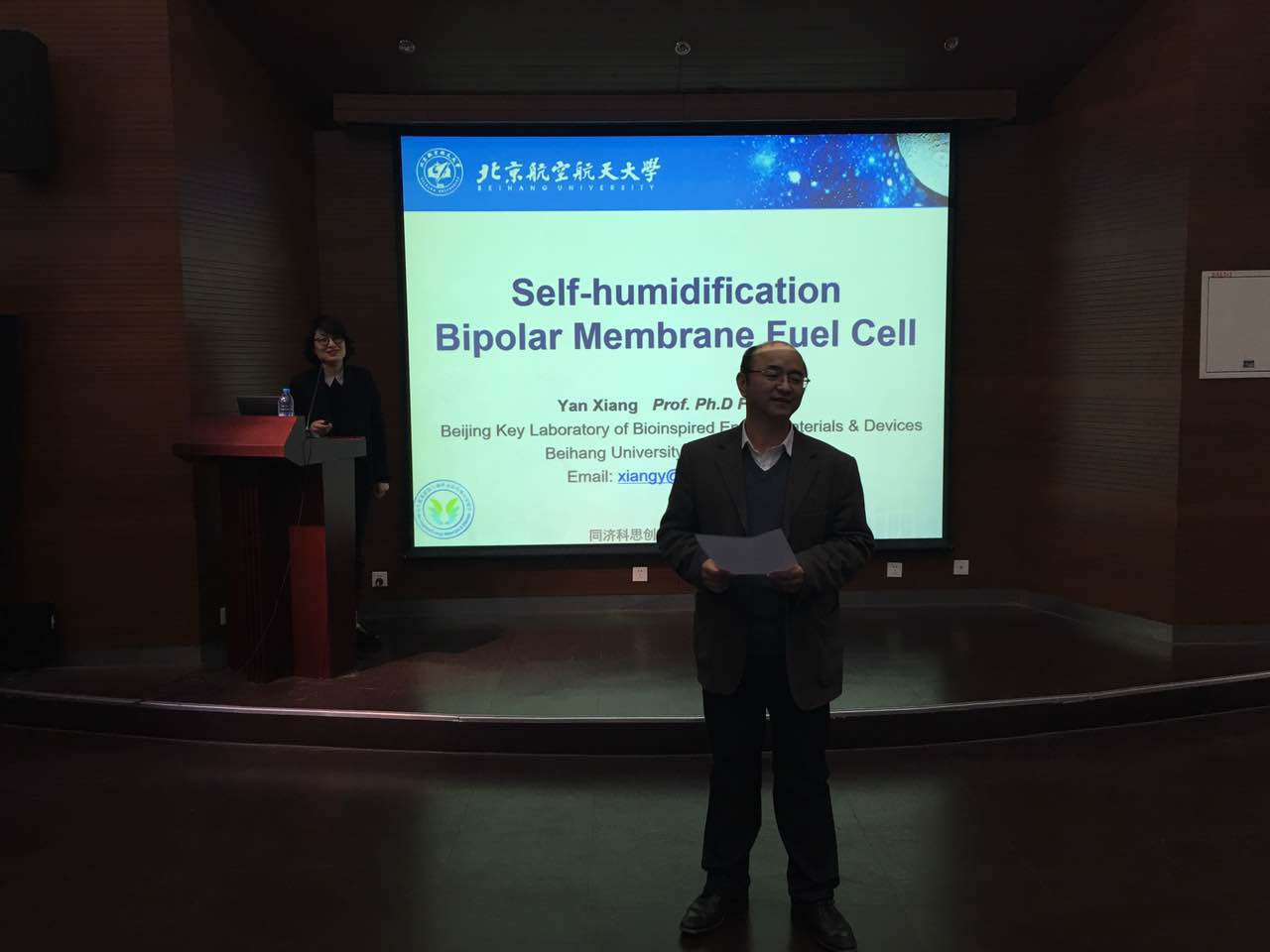 下午2时许,在同济大学嘉定校区德才馆(材料学院)二楼报告厅,黄云辉教授主持了由相艳博士主讲的同济科思创杰出学者讲坛。相艳博士做了题为“自润湿双极膜燃料电池界面行为研究”的学术报告,就双极膜燃料电池的膜材料、界面原理和器件等几个方面做了详细介绍,并与在场的师生进行了热烈的交流与讨论。