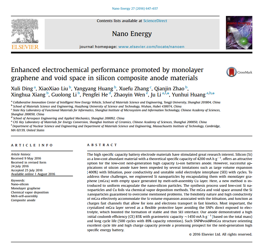 近日,我院研究团队在纳米能源领域顶尖期刊《Nano Energy》(IF=11.55)上发表了题为《Enhanced Electrochemical performance promoted by monolayer graphene and void space in silicon composite anode materials》的文章。该论文的第一作者为该团队丁旭丽副研究员,通讯作者为黄云辉教授,BB贝博艾弗森官方网站为论文的第一作者单位。