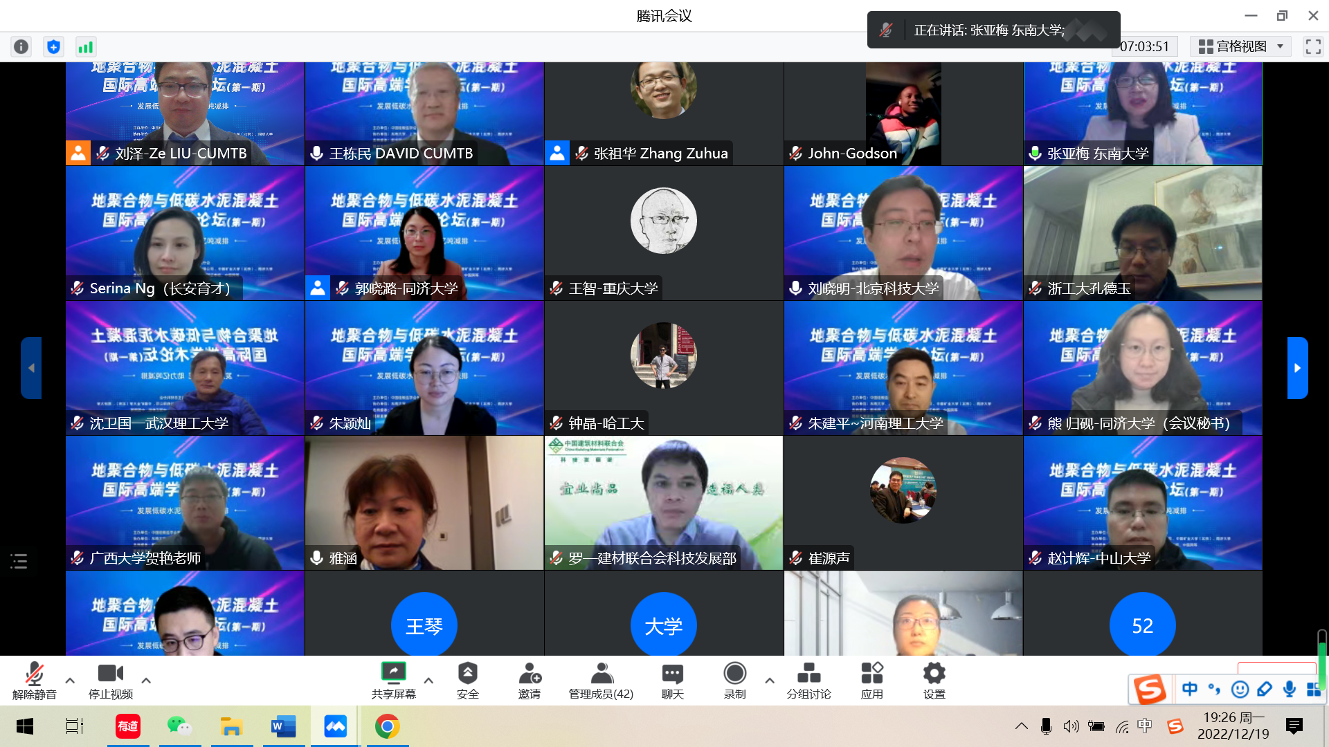 2022年12月19日由同济大学联合承办的“地聚合物与低碳水泥混凝土国际高端论坛 (第一期) ”线上隆重召开。会议以“发展低碳水泥,助力亿吨减排”为主题,采用线上腾讯会议和全网免费直播形式进行。BB贝博艾弗森官方网站郭晓潞教授、张祖华教授作为联席主持人主持了该论坛,蒋正武教授作为特邀嘉宾出席了该论坛,青年教师卢子臣副教授、任强博士后等,以及地聚合物研究相关课题组组织研究生参加了该会议。