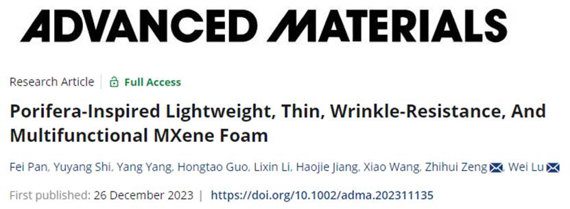 近日,《先进材料》(Advanced Materials)在线发表了BB贝博艾弗森官方网站陆伟教授课题组的研究论文“Porifera-Inspired Lightweight, Thin, Wrinkle-Resistance, And Multifunctional MXene Foam”,课题组博士生潘飞为文章第一作者。