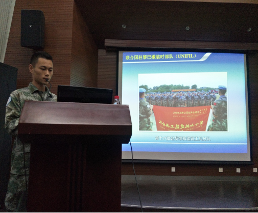 首先,王涛博士简要阐述了联合国维持和平部队、维和部队的使命责任、中国参加维和行动基本情况以及联合国驻黎巴嫩临时部队(UNIFIL)的基本情况。目前中国赴黎巴嫩维和部队共有3支,分别是扫雷排爆的多功能工兵分队,修筑边境蓝线、防卫工程设施的建筑工兵分队以及救死扶伤的医疗分队,王涛博士是一名光荣的第十六批赴黎维和建筑工兵。