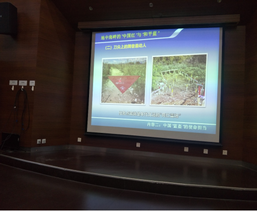 接着,王涛博士生动讲述了中国“蓝盔”的使命担当。1990年4月,我国首次参加联合国维和行动,我国累计派出维和军事人员3.7万余人次。维和任务危险重重,扫雷排爆随时都会有生命危险,虽然危机四伏,但是中国的维和人官兵克服了一切的困难在死亡“雷场”旁建立了“蓝线”和平界桩,顶着40℃的高温高质量的完成蓝桶修建任务,他们的努力得到了联合国的认可,获得了维和部队最高集体荣誉奖——“司令嘉奖”。
