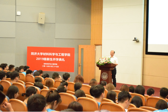 学院学科委员会主任黄云辉教授首先代表学院热烈欢迎来自全国各地的新同学们加入同济大学材料学院这个大家庭,并向同学们介绍了学院从建院之初的发展以及目前的状况。他表示21世纪是属于新材料、新能源的时代,大家能够成为材料学院的一员是幸运的,因为材料将在各个行业均发挥了举足轻重的作用,国家对新材料发展的重视,均为我们带来了机遇和挑战,我们也必将在材料领域将大有可为。同时黄云辉教授也再次强调了校长在开学典礼上的叮嘱,同学们应该将"坚守、求真、创新,做国家和民族的擎天之柱"作为自己的奋斗理念,成为德才兼备的专业精英,期待同学们既要仰望星空,又要脚踏实地,把国家命运和自身命运联系在一起,满怀求知之志,实现自己的人生价值。