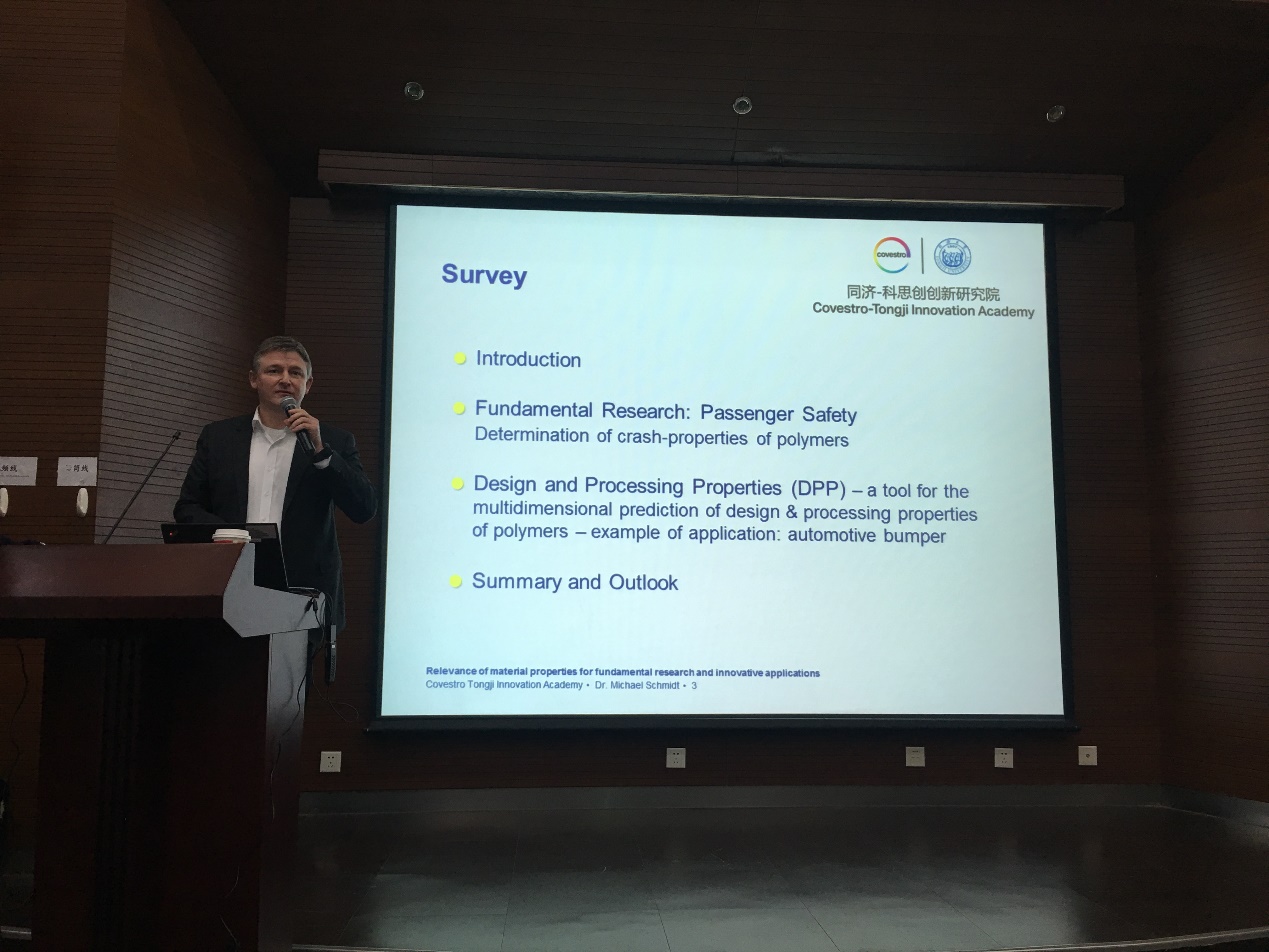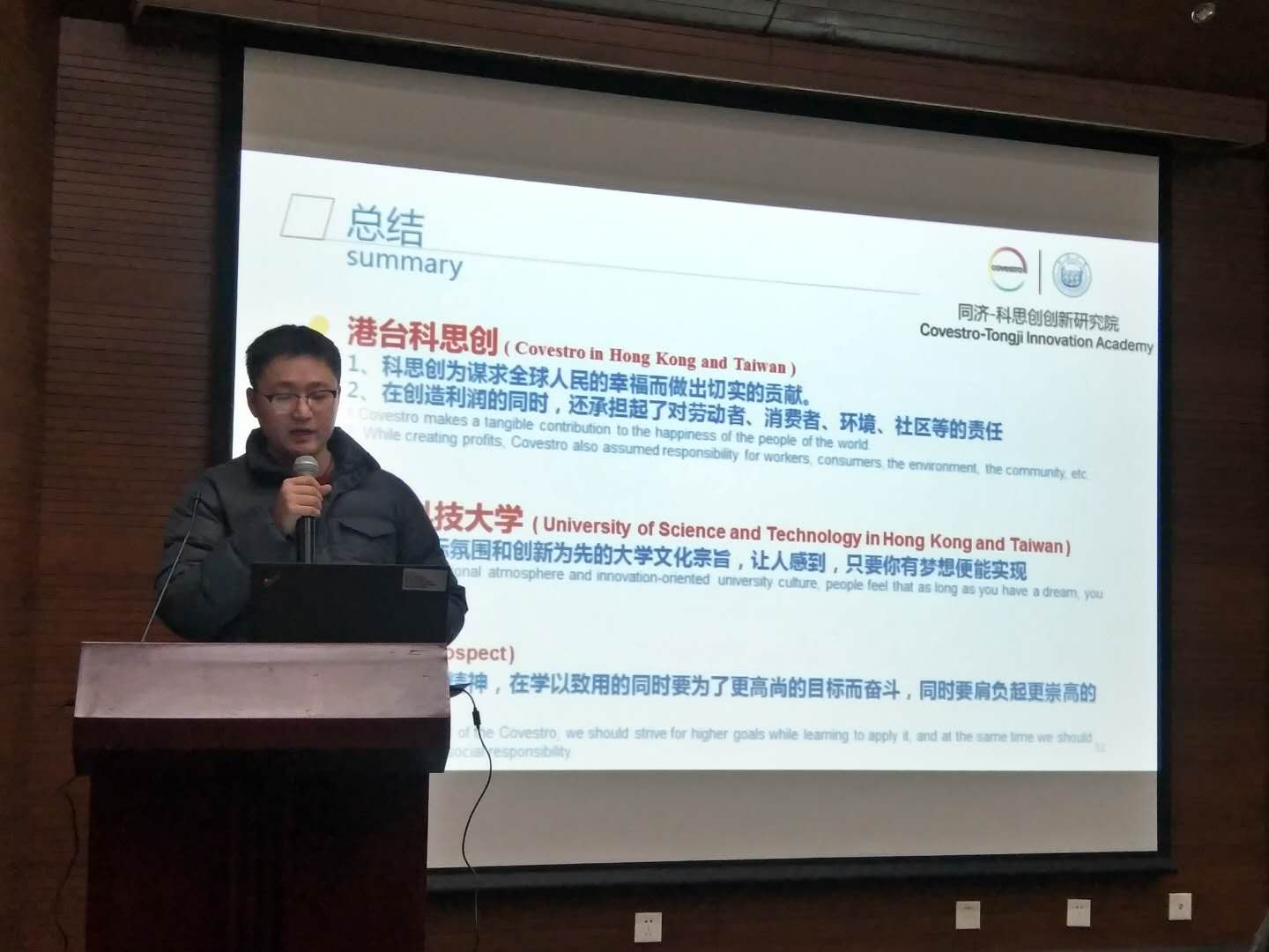 12月11日13时30分,材料科学与工程学院在德才馆二楼报告厅举行“同济-科思创特邀报告暨暑期实践总结大会”,学院2018级研究生、2016级本科生以及参加德国和港台暑期实践的同学前来聆听学习。本次大会共分两部分,第一部分特邀同济-科思创创新研究院院长、科思创亚太区创新负责人、科思创聚合物研发中心负责人施马可博士(Dr. Michael Schmidt)为学院师生做报告,第二部分由暑期实践交流团的学生代表——2015级本科生陈钰婷和2017级研究生王啸夫为大家做交流总结汇报。此次大会由学院党委副书记王凌凌老师主持,王德平、许乾慰、黄佳、张任远等教授出席了本次大会。