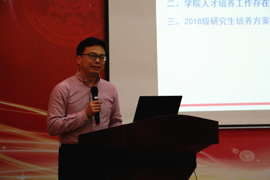 邱军副院长做了才培养工作报告,邱军首先概述了2018年教育部高教会议及相关人才培养的重要文件精神,总结了学院教学工作经验和存在的问题,他说工程教育理念认识亟待加强;立德树人及课程思政教育要进一步落实;课堂教学效果及考核方法有待提高和教学成果要总结积累。他说学院拟将加强教学基层组织建设,建立教学团队;加大教学工作的督导,鼓励教学效果优秀的教师;建立教学成果的奖励制度;改变原有教学津贴分配制度,提高超学时津贴,鼓励教师上课等。
