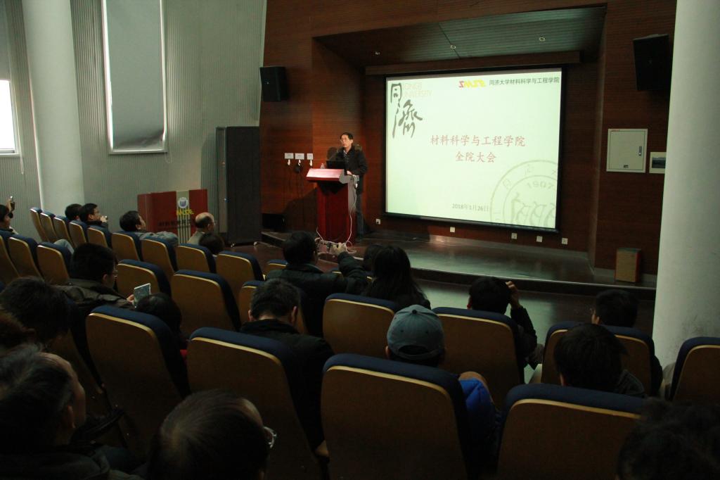 1月26日下午,材料科学与工程学院全院大会在德才楼二楼报告厅顺利召开。会议由学院党委书记王中平主持,学院党政领导班子成员、全院一百一十余名教职工出席会议。