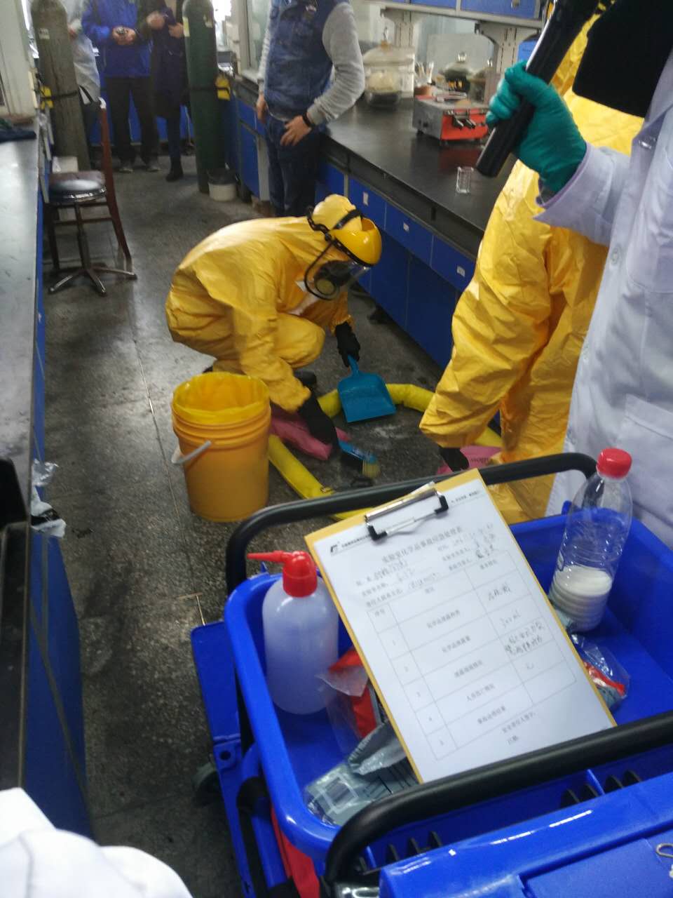 11月30日下午,嘉定校区材料学院连同设备处、保卫处和无锡赛弗金属制品有限公司在材料学院4楼高分子实验室进行了模拟300ml浓硫酸倾倒应急处置演练。我校保卫处贾晓航,设备处葛晨晨和我院高分子系金明教授、李文峰、专业实验室朱东明老师等参加演练。