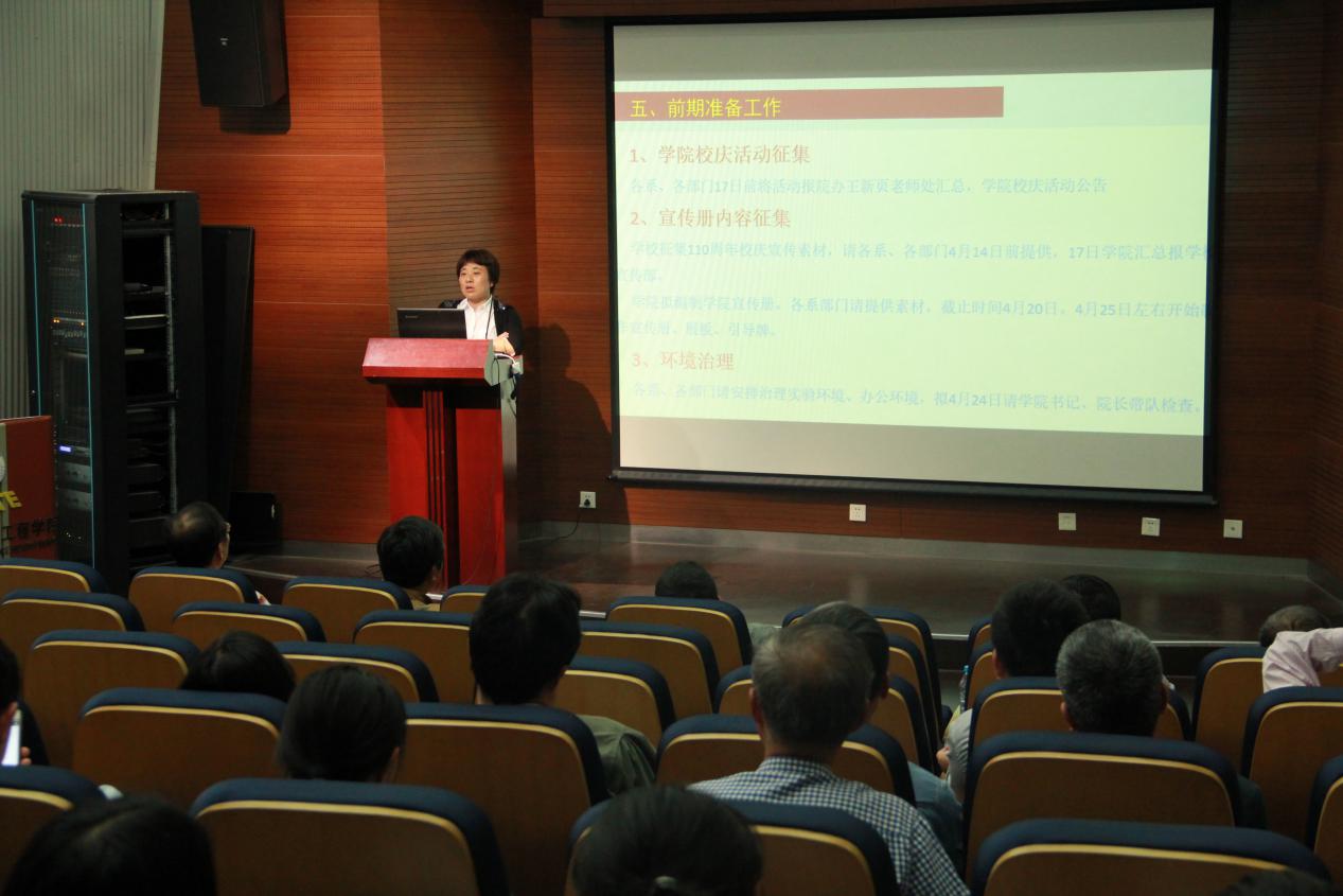 袁华介绍了110周年校庆期间学院校庆活动筹备情况,要求全院师生集思广益,献策献计,联络校友,共庆佳节。她说,同济大学是广大在职师生的同济大学,也是广大校友的同济大学;110周年校庆是广大校友的盛会,也是在校全体师生的盛会。学院将遵照学校“隆重简朴、务实高效,创新特色”的原则,紧密围绕“可持续发展”这一主题,作好学院校庆安排及宣传接待工作,并以此为契机总结办学经验,弘扬同济精神,展示历史成就,营造文化氛围,凝聚各方力量,助力未来发展。