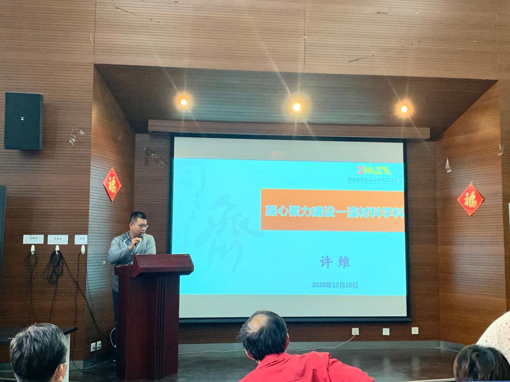 接着,许维以《凝心聚力建设一流材料学科》为题,通报学院十四五规划。他首先肯定了学院十三五期间的亮点工作,如:国家高层次人才计划取得突破性进展;基础研究方面取得重要进展;科研能力水平进一步提高;学科建设发展进一步提升;立德树人成效进一步显著。这些亮点工作使得材料学科国际影响力稳步提升。接着,他分析了学院当前的形式、挑战和机遇。同济大学“虹桥枢纽”的学科特色,使得我们既要深挖材料基础研究中的重大科学问题,又要挑战材料工程实践中的重大技术难题。科学研究能力薄弱、人才培养质量不高、高层次人才数量不多等是当前我们面临的挑战。同时,学科迎来的机遇,在国家层面,党的十九大报告指出,要瞄准世界科技前沿,强化基础研究,实现前瞻性基础研究、引领性原创成果重大突破。学校层面,同济大学提出“基础研究提升计划”。最后,他提出自己的总体思路。贯彻学院“两轮驱动、人才引领”战略方针,以文化为牵引,以制度为根本,以学术为导向,以人才为抓手。使学院人才引领效应进一步显现,学院学科能级进一步提升。