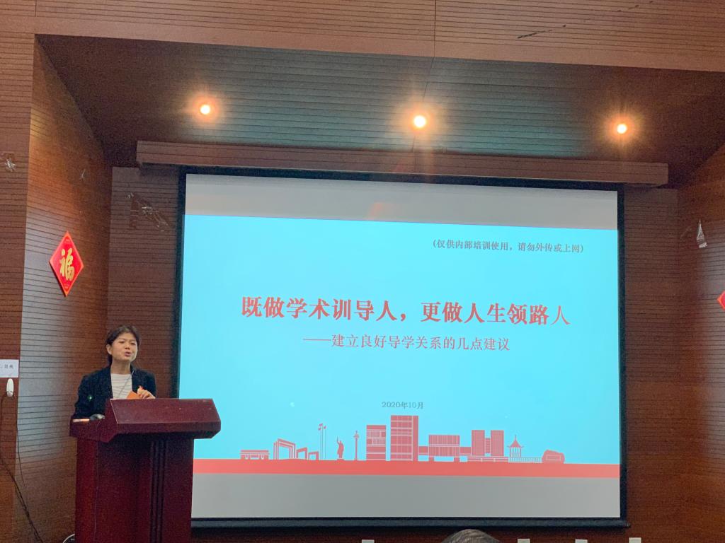 王凌凌副书记作了题为《疫情常态下导学关系的心理培训》的主题讲话,总结了研究生学习生活中面临的新情况和容易引发师生关系不和谐的风险点,用一个个典型的事例诠释优秀导师并警示导师,对建立良好导学关系提出了建议和期望,希望导师聚焦学生学业,言传身教、尊重、合作,及时沟通、心灵相容,注重人文关怀,成为学生的良师益友。