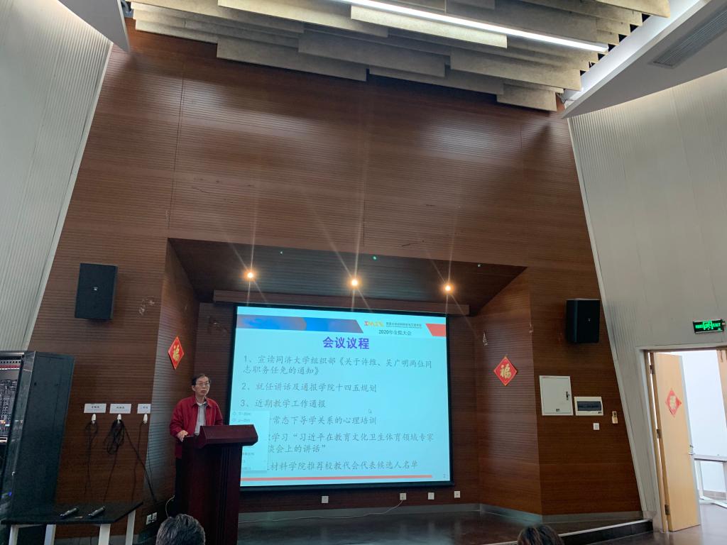 10月20日下午,材料科学与工程学院2020年第八次全院大会在德才馆二楼报告厅顺利举行,会议由学院党委书记王中平主持,主持行政工作副院长许维、党委副书记袁华、王凌凌、副院长翟继卫、邱军、姚武和全院教职员工共计一百一十余名参会。