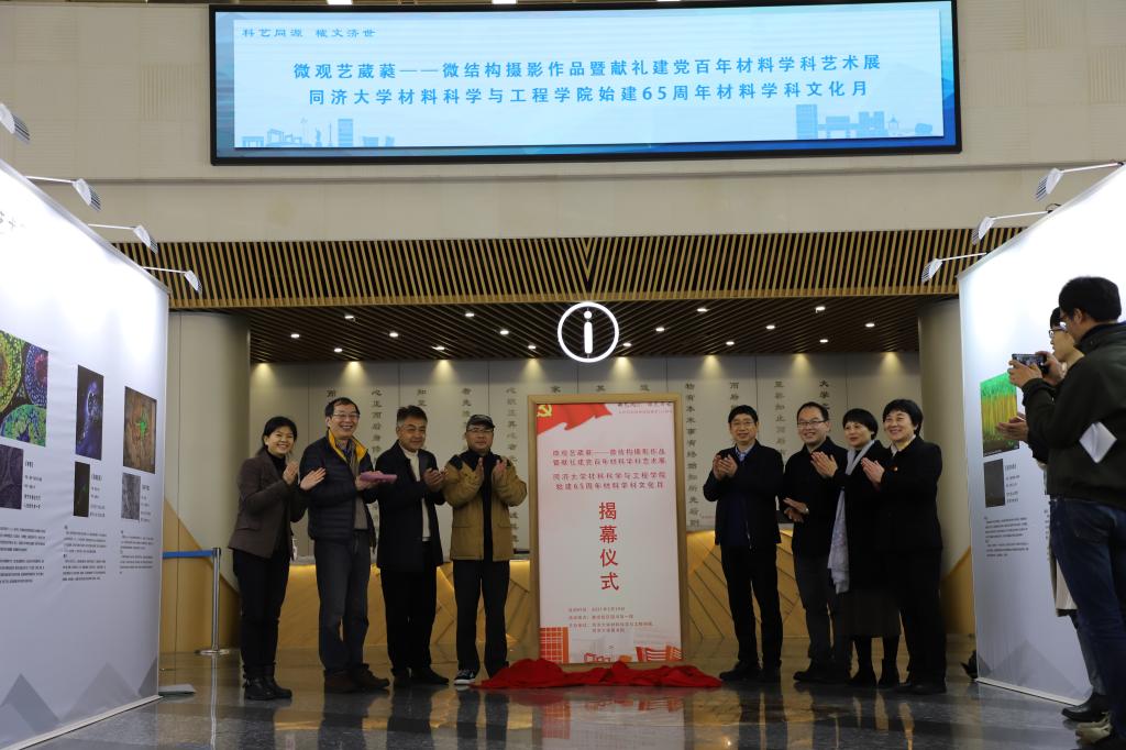 吴广明书记为本次开幕式致辞。他指出说,大学文化是国家文化软实力的核心基础,是国家软实力极其重要的部分。同济大学在长期的办学历程中,形成了独具特色的大学文化,集中体现在以“同舟共济,自强不息”为核心的同济精神,体现在以“同心同德同舟楫,济人济事济天下”为特色的人文情怀,体现在以“矢志不渝的爱国传统,严谨求实的科学态度,自强不息的奋斗精神,同舟共济的和谐理想”为内涵的精神价值。同时,高度肯定了材料在人类发展史上的重要作用,材料发展史就是一部人类发展文明史、文化史,材料学科对于解决卡脖子问题关键作用。这次联合举办的“微观艺葳蕤——微结构摄影作品展“通过材料微结构的艺术展示,实现了科学与艺术的交融,展示了独特材料文化的魅力。最后,吴广明及莅临嘉宾们共同为“微结构摄影作品展”揭幕。