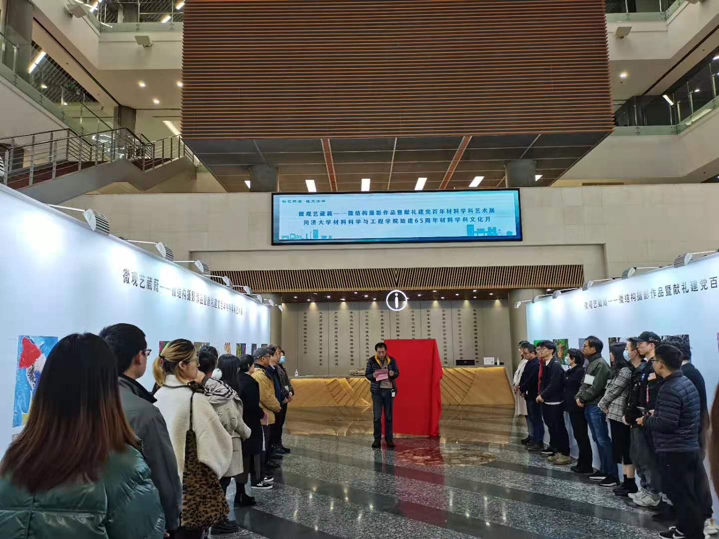 2021年3月19日下午,材料科学与工程学院与图书馆联合主办的“微观艺葳蕤——微结构摄影作品展暨献礼建党百年材料学科学科文化月”系列活动在嘉定校区图书馆一楼大厅正式开幕。开幕式由材料学院党委书记王中平主持。校党委副书记吴广明,嘉定校区党工委副书记覃文忠、学研工部副部长谭武、艺术与传媒学院教授于澎一同出席了开幕式。图书馆党委副书记何青芳、材料学院党委副书记袁华、王凌凌等图书馆、材料学院教师、学生代表近50人参加开幕活动。