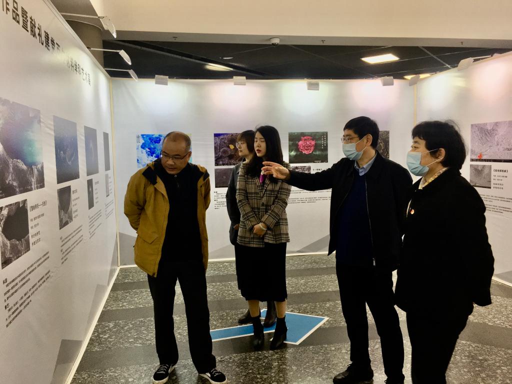 王中平书记首先介绍了微结构摄影作品展背景, 2021年中国共产党迎来百年华诞,材料学院恰逢65周年院庆,举办材料学科文化展,以传承红色基因,推进校园文明建设,促进文理学科交叉,助力大学文化建设,展现文化育人品牌,为党的百年华诞献礼。本次展出的100幅微结构摄影作品,是2020年全国微结构摄影大赛的获奖作品,是我校以及兄弟高校师生创作的优秀作品代表,不仅将材料学科文化与艺术融合,更讴歌了伟大英明的中国共产党和奋勇当先的英雄人民。他特别感谢图书馆对这次摄影作品展以及长期以来给与材料学院文化建设的支持。