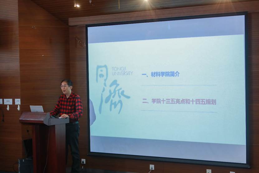 材料学院党委书记王中平介绍材料学院。他从学院历史沿革、专业设置、学院组成及学院特殊等方面介绍了学院基本情况,并对学院十三五期间取得的亮点工作和十四五的规划进行了介绍。