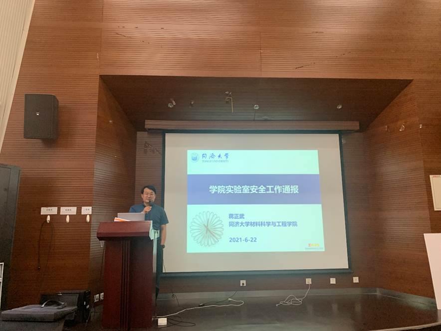 蒋正武老师通报了学院实验室安全工作,首先传达了2021年上半年学校安全大会的会议精神和要求。其次,通报了2021年教育部实验室安全现场检查与问题整改工作。根据教育部部署,5月25日,教育部高校实验室安全检查专家组一行来到同济大学开展实验室安全现场检查,共发现27个整改项(学校层面3个、学院层面1个、实验室层面23个)。按照教育部要求,各单位就现场检查发现的问题进行研究讨论,布置落实整改方案和责任人。再次,材料科学与工程学院安全管理制度颁布,并且已经邮件发给各位老师,望大家遵照执行。最后通报了近期学院安全事故,希望大家安全的警钟长鸣。