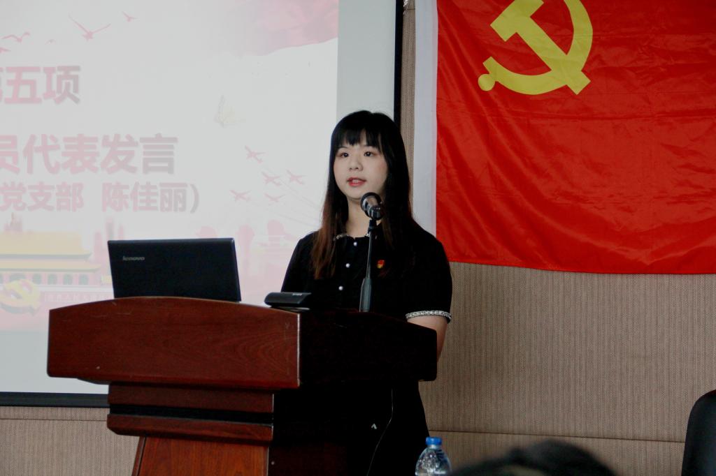 学院优秀共产党员代表陈佳丽同志刚转正半年,在入党的培养发展过程中,深刻体会共产党人的职责和使命,坚持服务学校、学院和身边群众,积极活跃在疫情防控、志愿服务、兼职辅导员岗位中,做出了许多的贡献。陈佳丽发言道:在过去的工作中,只是做了自己应该做的,尽了自己作为一名中国共产党党员应尽的义务,组织上给了如此大的荣誉,深感责任重大。在今后的学习工作中,一定珍惜荣誉,再接再厉,让胸前的党徽,在平凡的岗位上发光。