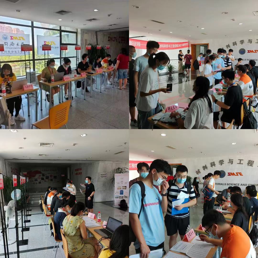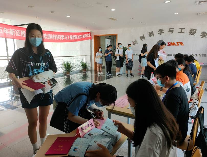早上8点整,材料学院迎来了第一位新生。为积极响应国家及学校疫情防控政策,本次迎新工作专门安排一位同学对所有进入同心楼的人员进行体温测量以及引导。同时,同心楼三楼迎新工作小组也立刻进入状态,每一位成员迅速行动,从人脸识别核验身份、扫描录取通知书、查验身份证、查验应届生毕业证书与学位证书、党团组织关系介绍信的提交、户口党组织关系的转移至研究生证的领取,再至领取院服、资料袋等,最后至各班班主任处报到,一步步过程看似复杂,却样样进行得有条不紊。