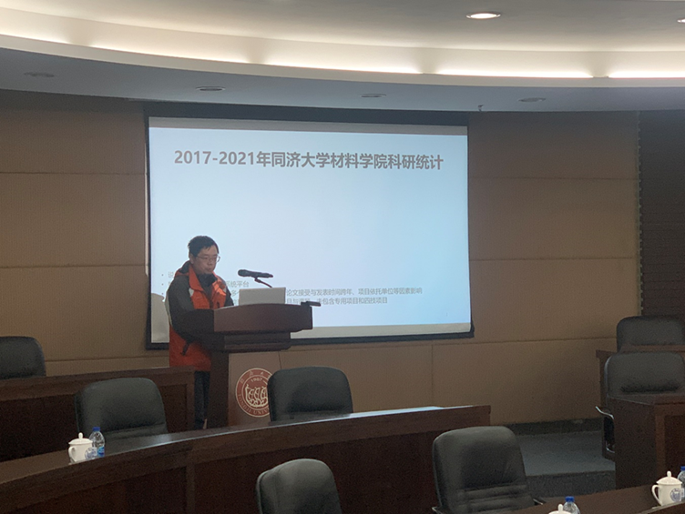 黄佳副院长向大家介绍了2017-2021年近五年学院科研情况统计结果,同时结合研究生培养分析了学院目前科研情况发展好的方面以及存在的问题。