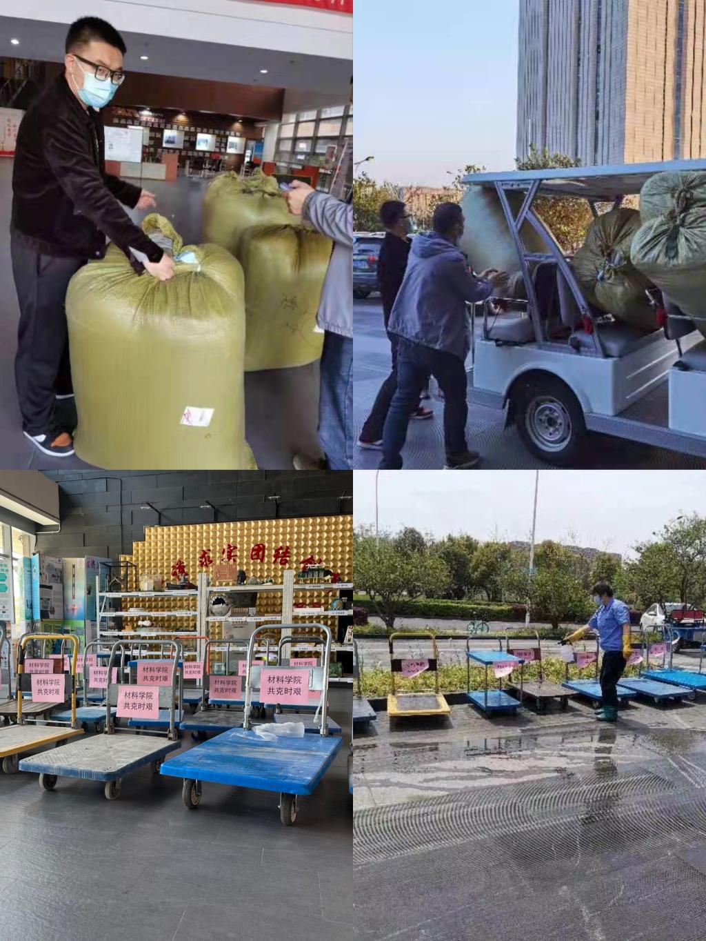 “嘉定校区的工作,材料学院不能置身事外!”嘉定校区进入准封闭管理后,学院第一时间向嘉定校区管委办支持被褥近80套,用于嘉定校区后勤、图书馆、临时隔离点等部门的疫情防控保障工作。在学生社区启动封闭管理后,学院又在第一时间向学院各实验室、课题组征集到18辆小推车,全部用于校区物资运输保障。这些充满“材情”的小推车,后来由学校统一调配支援友园14-15号楼和9-10号楼楼内物资的运输。在每一次突发的“第一时间”,学院总能想在前、做在先,以“疫”为令全院行动,尽己所能全力支持学校各项防疫工作。