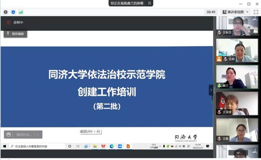 为认真落实依法治校工作精神,切实提高学院依法决策、民主管理和民主监督的水平,增强广大师生员工的法治观念和依法办事的能力,营造符合法治精神的育人环境,材料科学与工程学院积极参与学校依法治校示范学院创建工作,申报“同济大学依法治校示范学院”。5月27日,材料科学与工程学院邀请校长办公室的虞兰老师召开专题线上培训会,学院负责人及全体行政教辅人员共计20余人参加了本次培训会议。