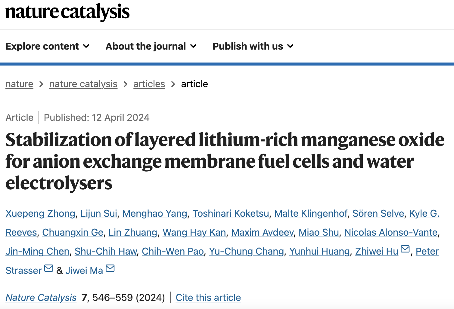 近期,马吉伟教授团队还在基于不饱和氧浓度调控构筑新型无铂氧化物催化剂方面取得了重要突破,相关研究成果以“Stabilization of layered lithium-rich manganese oxide for anion exchange membrane fuel cells and water electrolysers”为题发表于国际顶级期刊《自然·催化》(Nature Catalysis)。