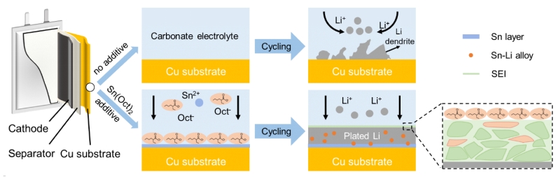 鉴于此,马吉伟教授团队基于界面调控对其开展了研究,首次开发了能够在商业碳酸酯电解液中应用的P区金属添加剂新家族。该团队以辛酸锡添加剂作为研究模型,证实了在碳酸酯电解液中,辛酸根基团能够优先吸附在铜基底上,诱导形成非碳酸酯基的保护层,从而抑制副反应的发生并有助于形成均匀的锂沉积。同时,锡离子在初始阶段可优先形成稳定的亲锂合金层,增强铜基底对锂的亲和性。在该添加剂辅助下,采用商业碳酸酯电解液的无负极锂金属软包电池展现出良好的循环稳定性,库伦效率高达约99.1%。此外,研究团队也证实了这一家族添加剂同样适用于其它碱金属电池(如钠金属电池),具有高度的普适性。