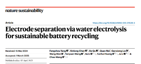 北京时间2025年4月3日,国际顶级期刊《自然·可持续发展》(Nature Sustainability)在线发表了BB贝博艾弗森官方网站王超特聘研究员团队的最新文章“Electrode separation via water electrolysis for sustainable battery recycling”,为利用电解水产气实现锂离子电池高效回收提供了新的路径和可能性。