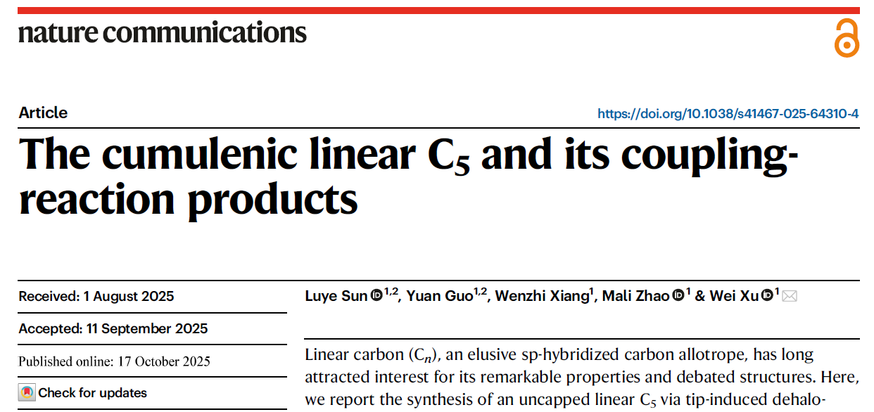 近日,我院许维教授团队在新型分子碳材料研究领域取得进展。9月26日和10月17日,《自然•通讯》(Nature Communications)先后在线发表了该团队的两篇研究论文,题为“An sp-sp2-hybridized molecular carbon allotrope C16 flake”和“The cumulenic linear C5 and its coupling-reaction products”。研究团队通过原子操纵技术,首次实现了sp-sp2杂化型C16片与系列线型碳的表面精准合成与精确测量。合成的新型分子碳材料作为碳基量子材料,在分子电子器件和磁性信息材料领域具有潜在的应用前景。