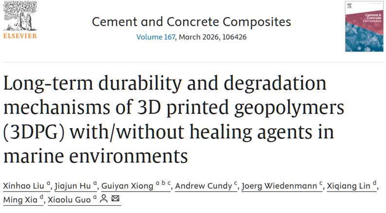 12月8日,我院郭晓潞教授团队研究成果以“Long-term durability and degradation mechanisms of 3D printed geopolymers (3DPG) with/without healing agents in marine environments”为题在线发表于Cement & Concrete Composites。