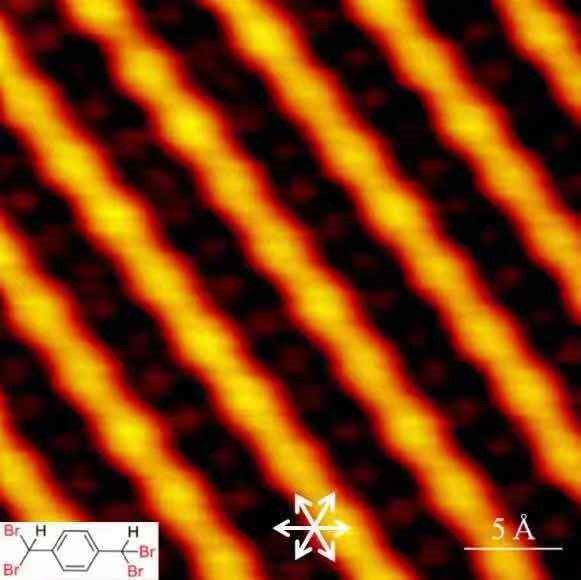 通过使用扫描隧道显微镜,我们在扫描面积为30 Å×30 Å的情况下,得到了清晰的PPV分子链形貌,在图片中,我们可以清晰的测量单个PPV链节大小,还可以清楚的看到分子及分子链的排列方式等。这为进一步确定成键方式和反应能垒奠定了基础。