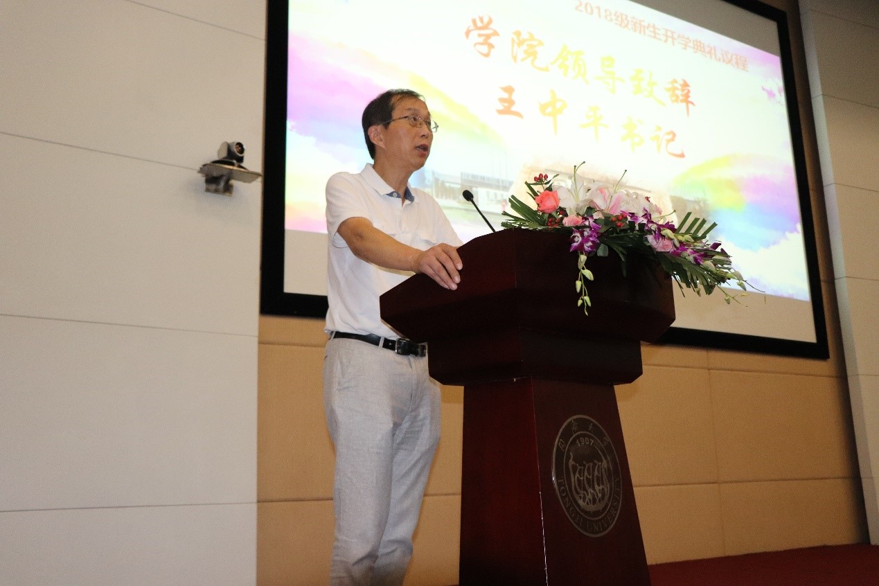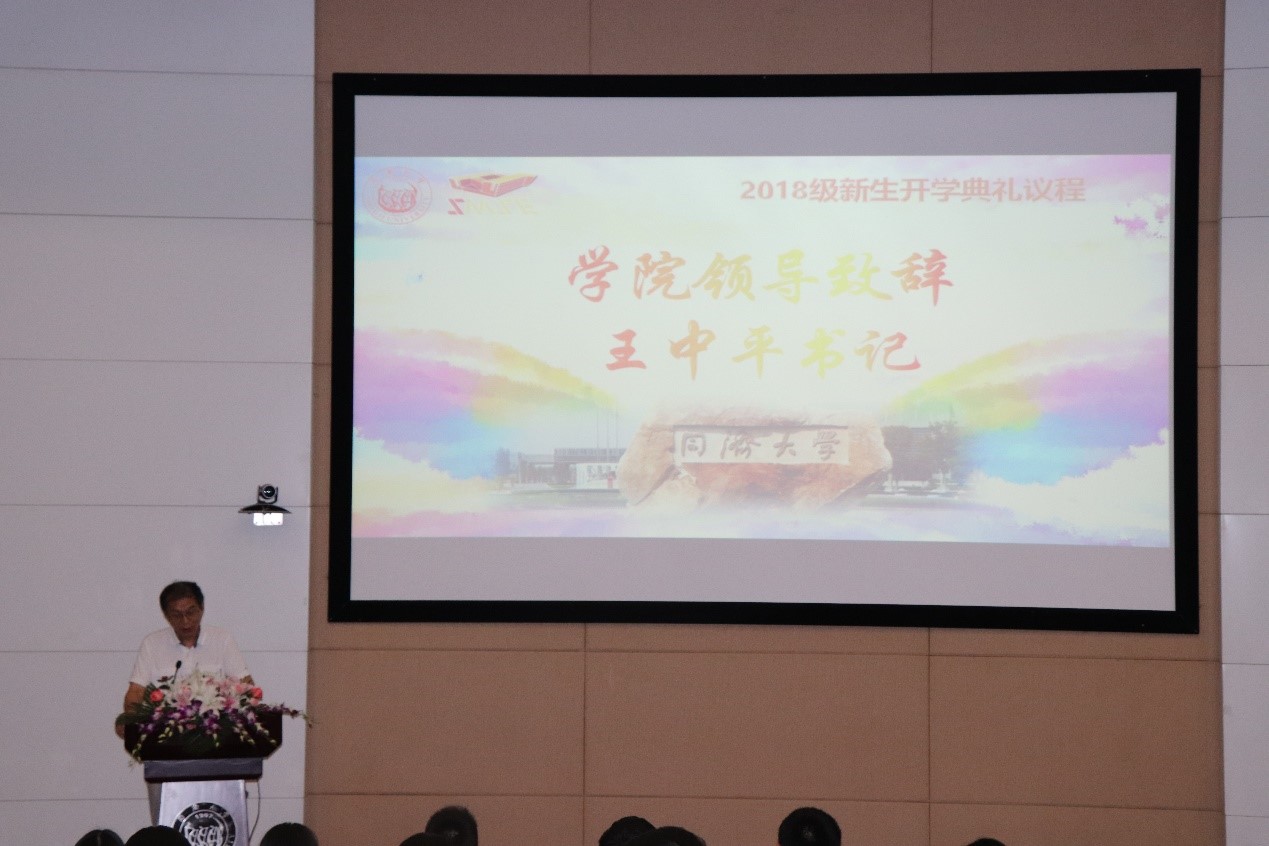 学院党委书记王中平教授首先代表学院热烈欢迎来自全国各地的新同学们加入同济大学材料学院大家庭,他为新生介绍了材料科学与工程专业的前身以及学院的情况,并表示了学院将每位学生培养为专业人才以及社会栋梁的决心与担当。王书记同时向新生提出三点希望:一、要有敢为人先的气魄,融会贯通、创新创造;二、要有穷理致知的执着,脚踏实地、久久为功;三、要有同济天下的担当,服务人民、奋斗无悔。在最后祝愿同学们开启精彩的生活,收获难忘的美好。