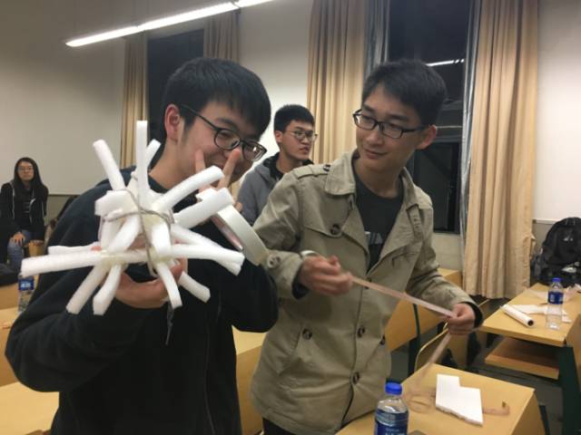 由于可利用的材料在数量和种类上都较为丰富,再加上同学们灵巧的设计,尽管工作人员将第一次鸡蛋下落的高度就设定为近两米半(人站在凳子上高举),所有的参赛组作品都成功通过了考验,一些同学意气风发之余甚至将鸡蛋高高抛起以示其牢固。