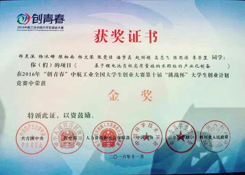 20161119日,2016年“创青春”全国大学生创业大赛决赛在电子科技大学落幕。我校选送6支团队参加全国决赛,取得321铜的好成绩。我校获金奖数量位列全国高校第6名,团体总分位列全国高校第10名,继2014年后再度捧得“创青春”创业大赛“优胜杯”。此次大赛,我校也刷新了参加“创青春”大赛以来的历史最高分数。其中由我院硕士研究生郑灵浪创办的革鑫纳米科技有限公司被组委会选为7个推介项目之一,参加大会路演。1122日下午,校长钟志华在逸夫楼会见获奖师生代表并热烈祝贺获奖团队。