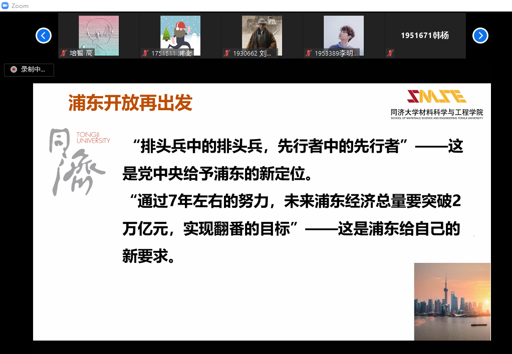 王中平老师主要讲述了从改革开放以来以浦东开发为中心阐述了中国发展的艰辛历程,过去三十年中,中国实现了由站起来到富起来的跨越,目前我们正向强起来跨越,浦东从过去的穷乡僻壤到如今经济发展的龙头,印证了党和国家改革开放决定的正确性,中国经济实现了腾飞,但目前正是百年未有之大变局,疫情暴发,经济整体衰退,港独台独以及一些西方政客仍在叫嚣,在这种情况下,我们更应该坚定思想,时刻与党和国家保持一致,国家的强大需要我们每个人贡献力量,我们作为同济学子,更应该明确自身责任,加强思想自信,民族自信,对一些基本事件以及大是大非面前,有自己的判断,不被一些西方言论蛊惑,王中平老师也提及到,爱国主义是一个人最基本的道德准则,爱国主义就要求我们自身命运与国家命运共戚,对一些侮辱国家侮辱人民的言行及人群予以坚决抵制。背叛国家是最可耻的行为,疫情也让我们看到,在灾难面前,党领导中国人民团结一致的力量是多么的强大,这也代表着我们国家的治理能力已经得到了增强,国家的发展与我们休戚相关,浦东的发展也有同济学子的一份贡献,将来中国走向强大,需要的是我们每位爱国青年做出自己的贡献,因此,我们应该努力学习,明确责任,回报祖国。