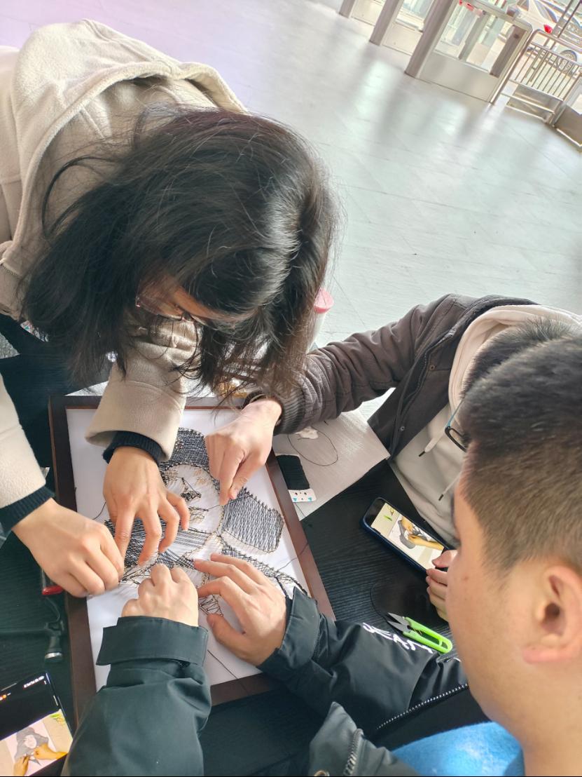 研究生第三党支部的同志们在此次学雷锋系列主题活动中制作了“党旗飘飘”和“雷锋画像”两幅绕线画。首先用一颗颗螺丝钉勾勒出图案的轮廓,再通过丝线反复缠绕将图案内部填充不同的颜色。弘扬雷锋精神要从当下干起,从小事做起,用一点一滴的实际行动做实事。绕线画工艺繁琐,需要极大的耐心,一个步骤出错可能前面已完成的部分都要重新来,但遇到困难不放弃,坚持到底才能胜利,从中体会到了雷锋艰苦奋斗、敢于斗争的精神。